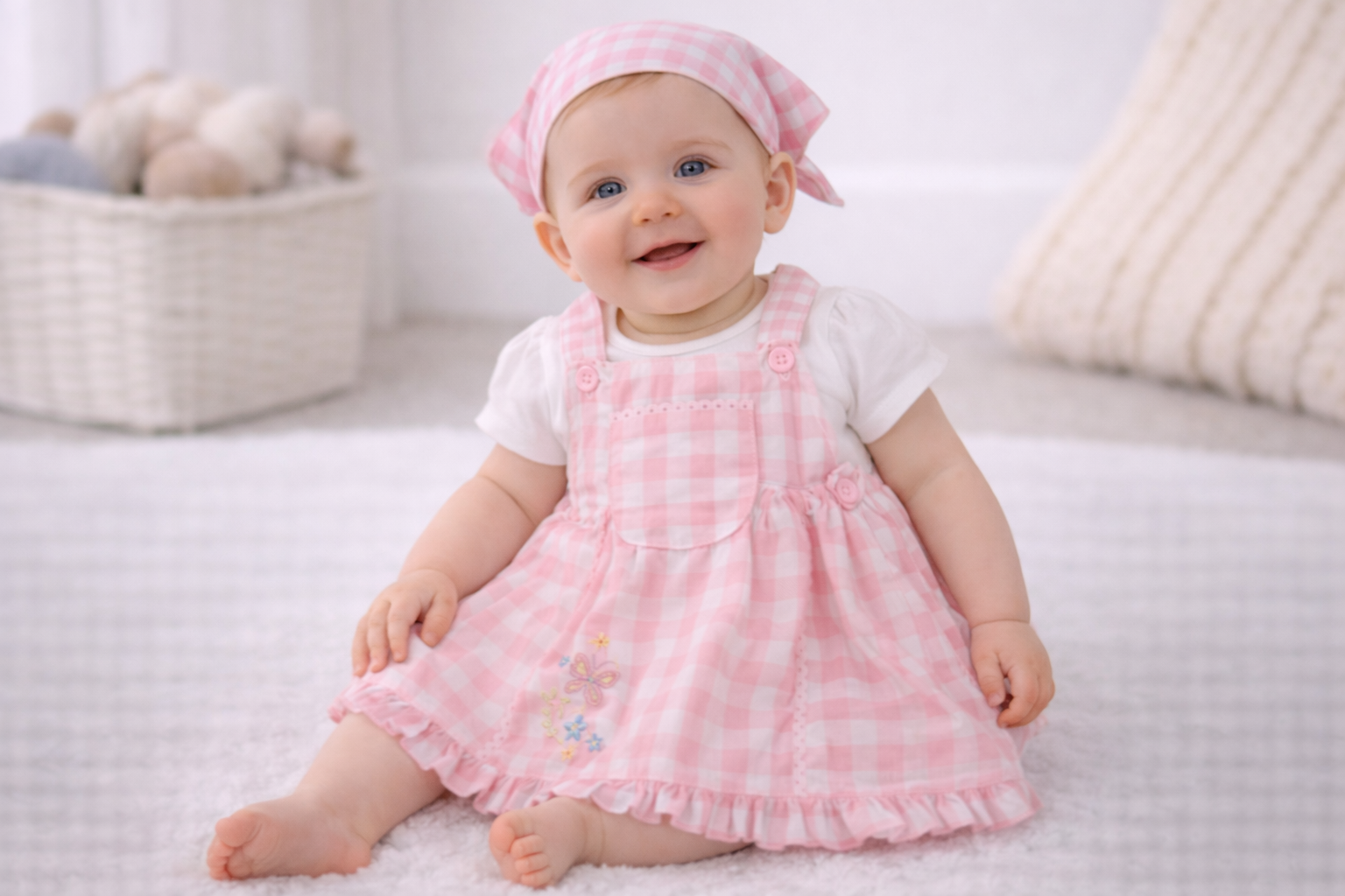 Adorable check pinafore dress with matching bandana — soft, stylish and perfect for everyday wear or gifting 💗🎀👶