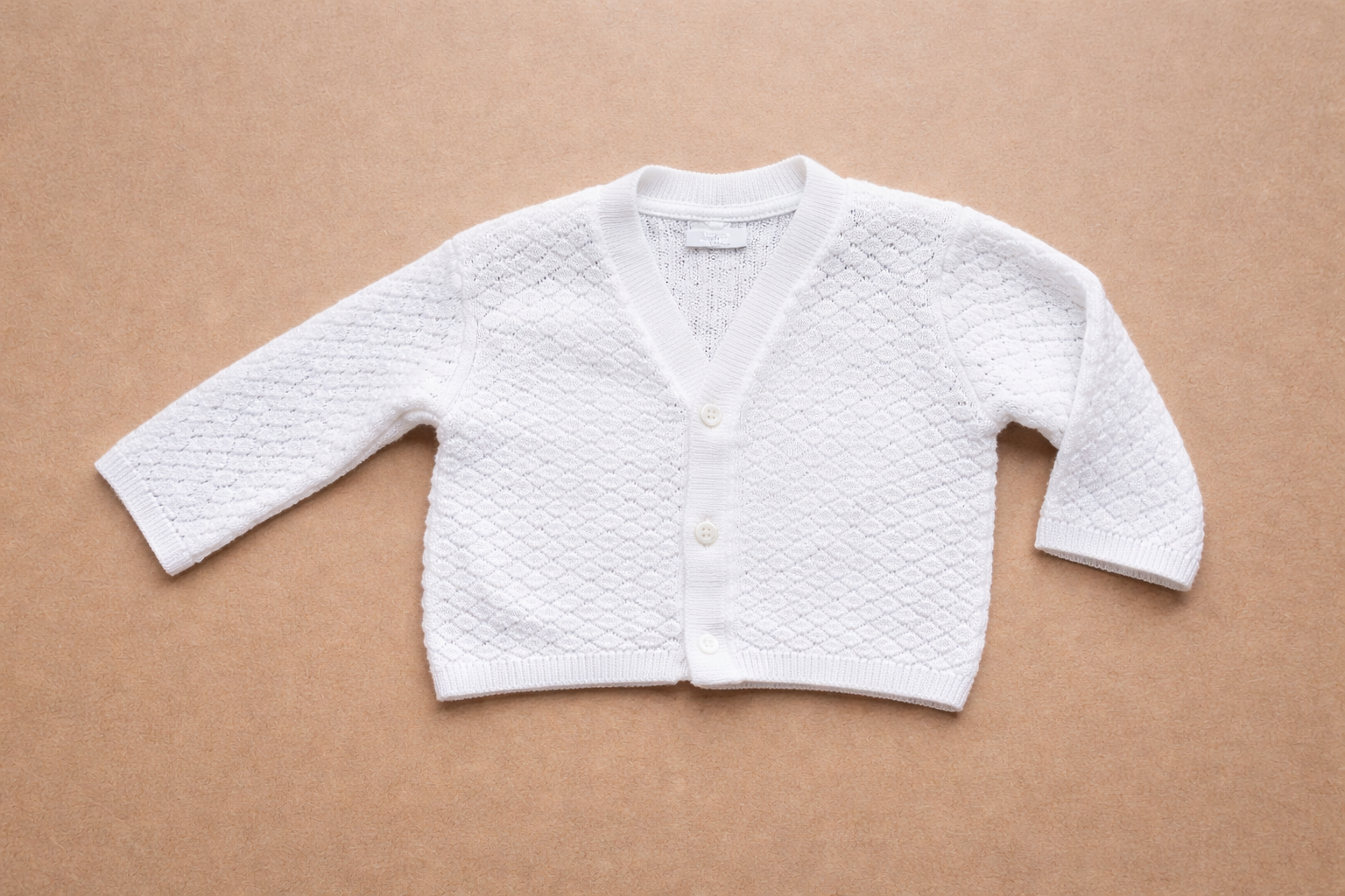A beautifully knitted baby cardigan featuring a classic V-neck design with a delicate diamond knit pattern and front button fastening. Crafted from soft acrylic yarn for warmth and comfort — perfect for layering over rompers, dresses or everyday outfits. A gentle, timeless piece suitable for both baby boys and girls.