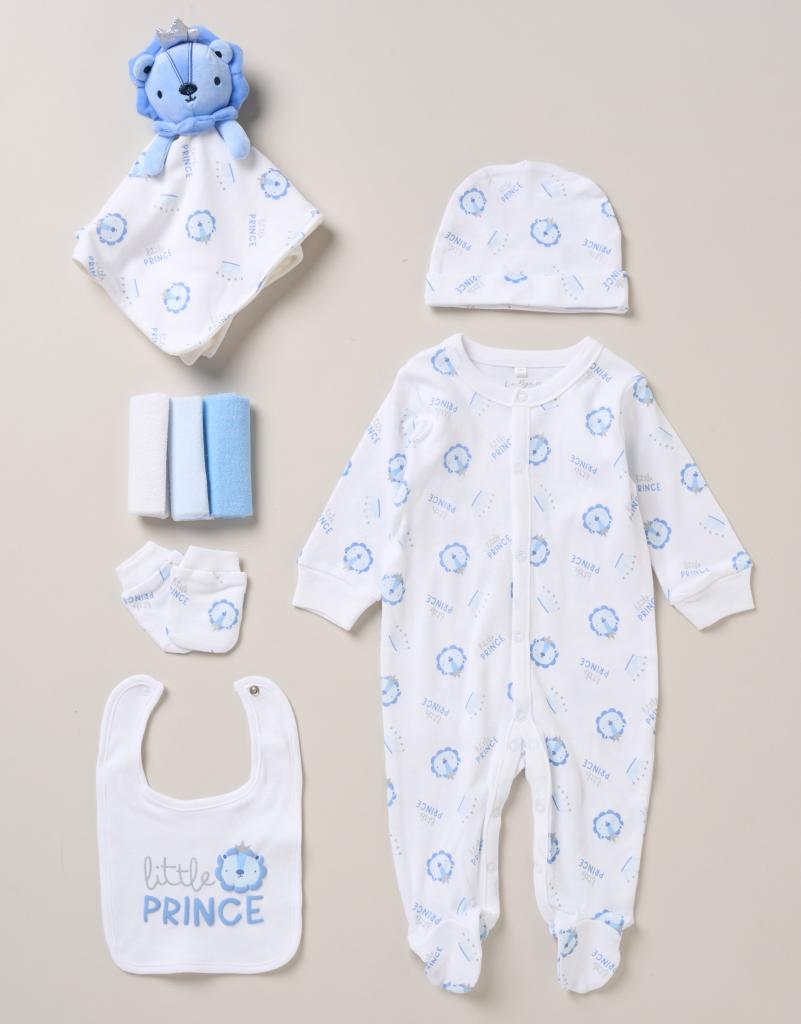 Sky/White “Lion” 8-Piece Newborn Gift Set | Baby Essentials in 100% Cotton (Newborn–6 Months)