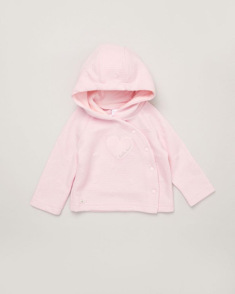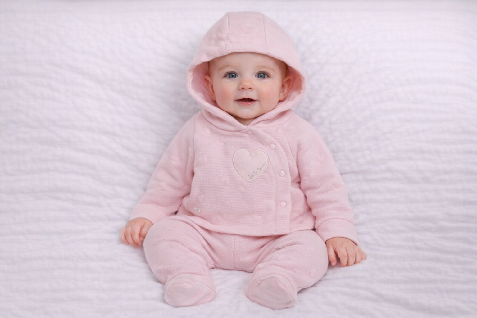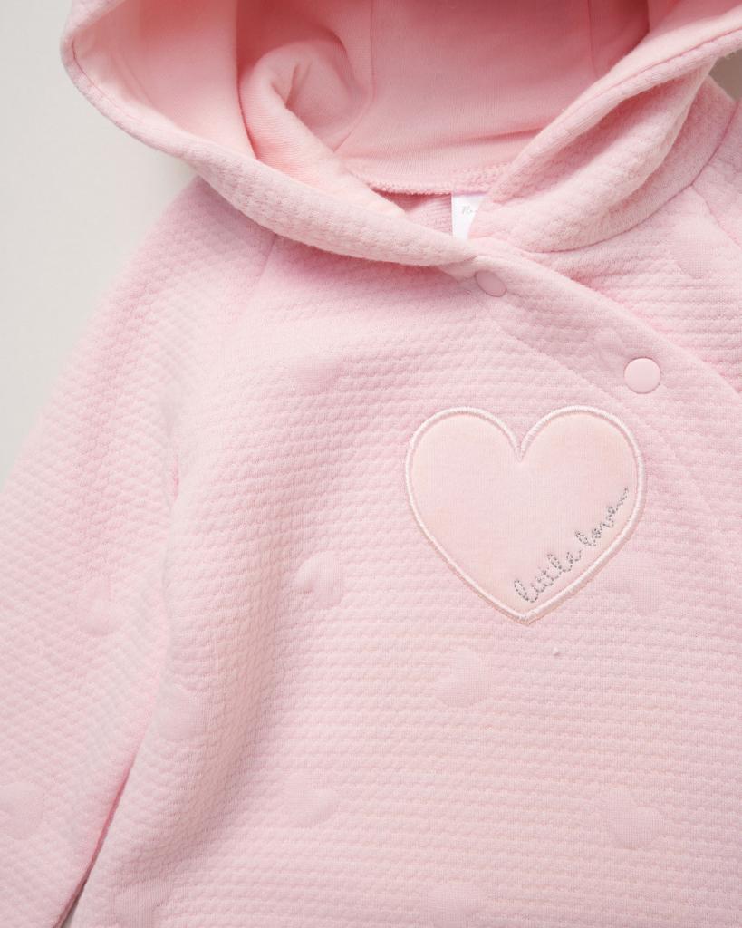 A beautifully soft and cosy two-piece baby set, perfect for everyday comfort with a touch of charm. The textured top features a hood, delicate heart detailing and a sweet “love” heart appliqué with embroidery, creating a lovely boutique finish. Coordinating trousers complete the set for a comfortable and stylish outfit.