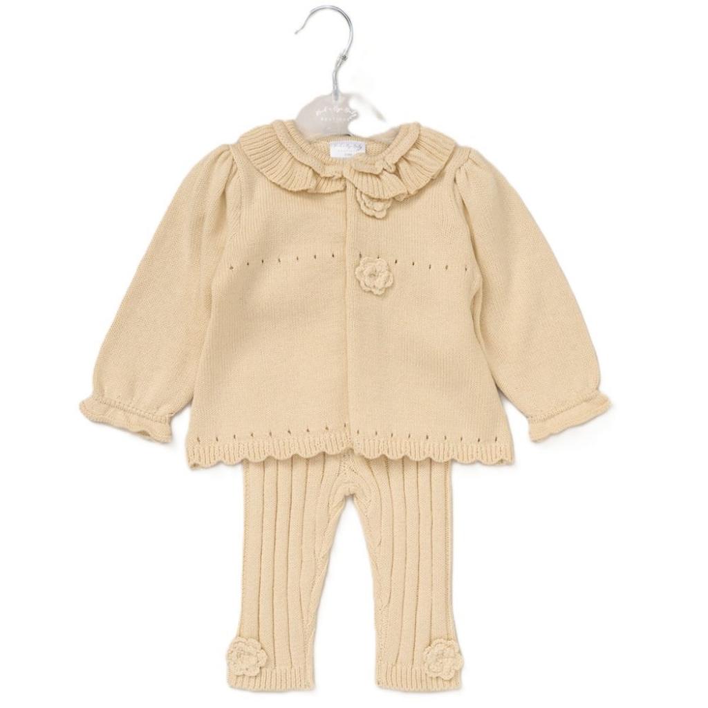 A soft and charming two-piece set in neutral biscuit, perfect for keeping baby cosy in style. The pretty knitted cardigan is finished with delicate frill edging and flower detailing, paired with matching trousers for a coordinated look.