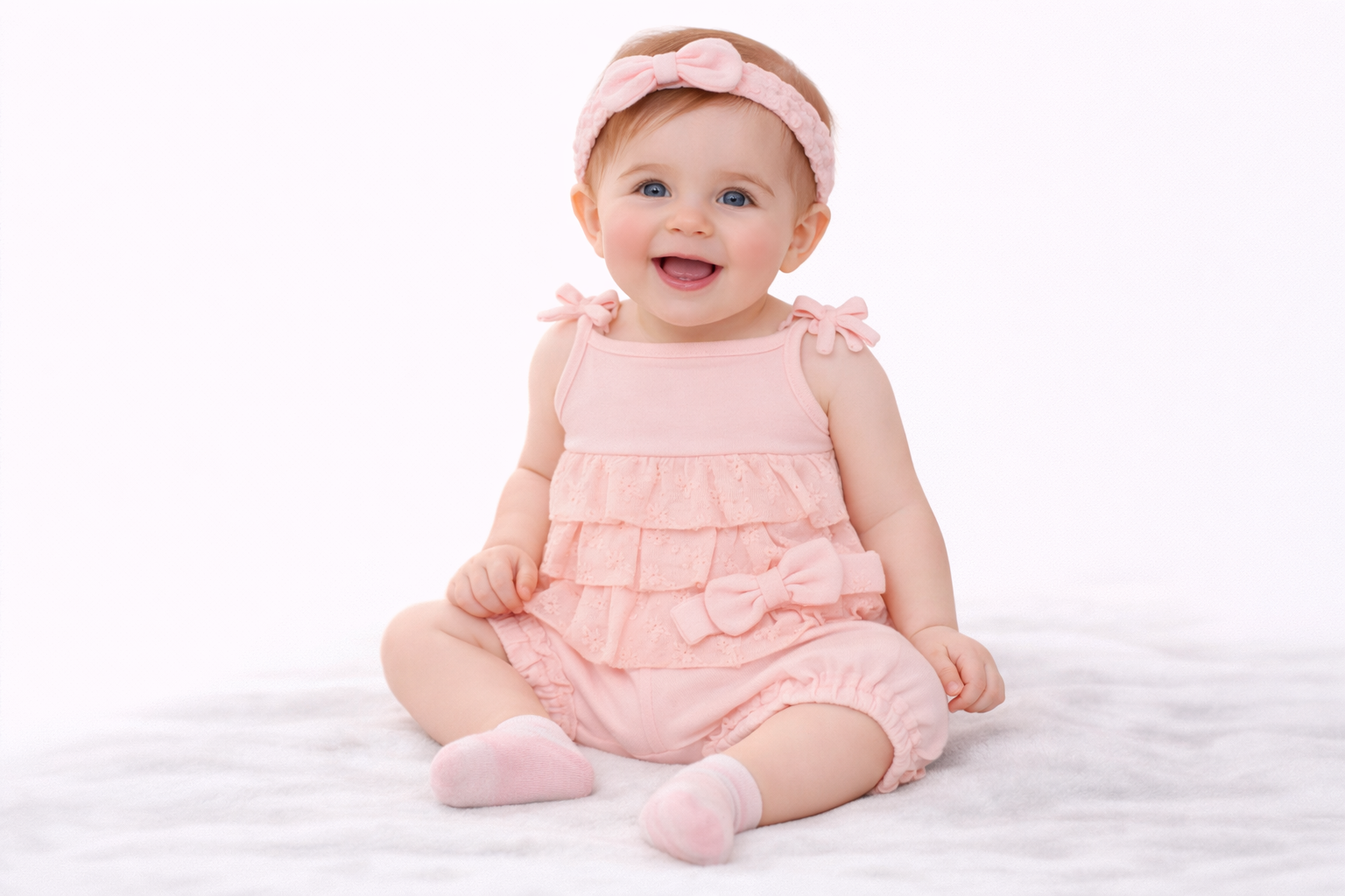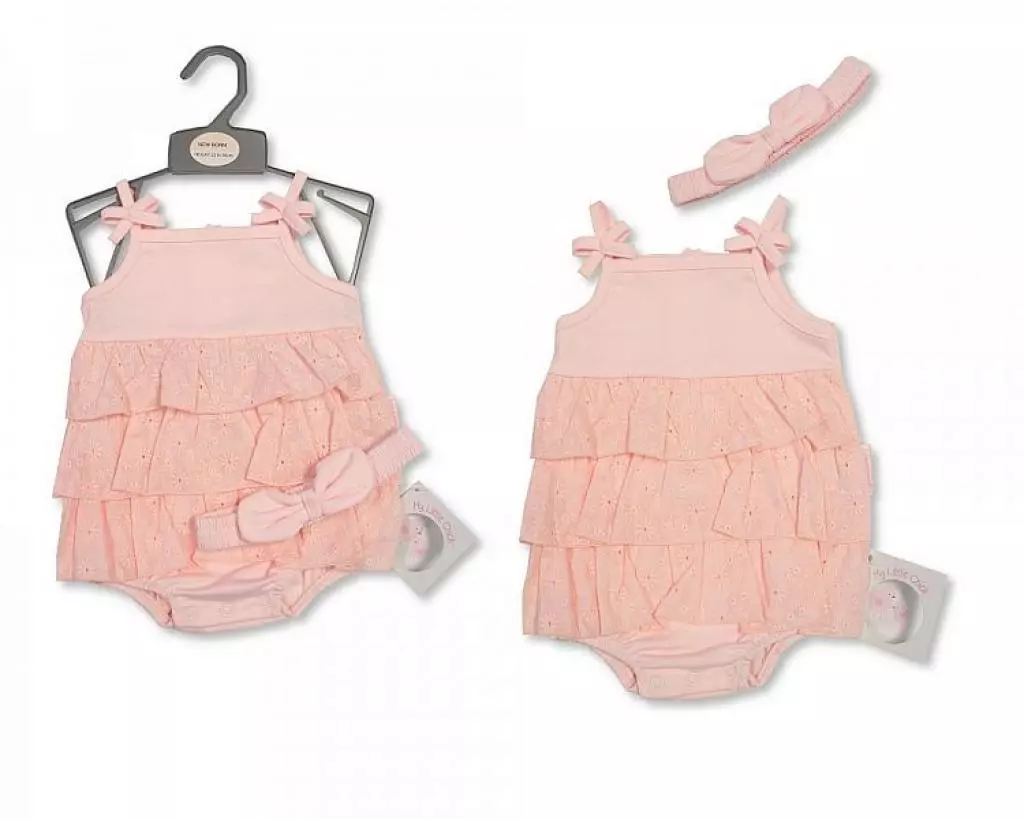 Pink Broderie Anglaise Tiered Sun Romper with Matching Headband – 3–6 Months