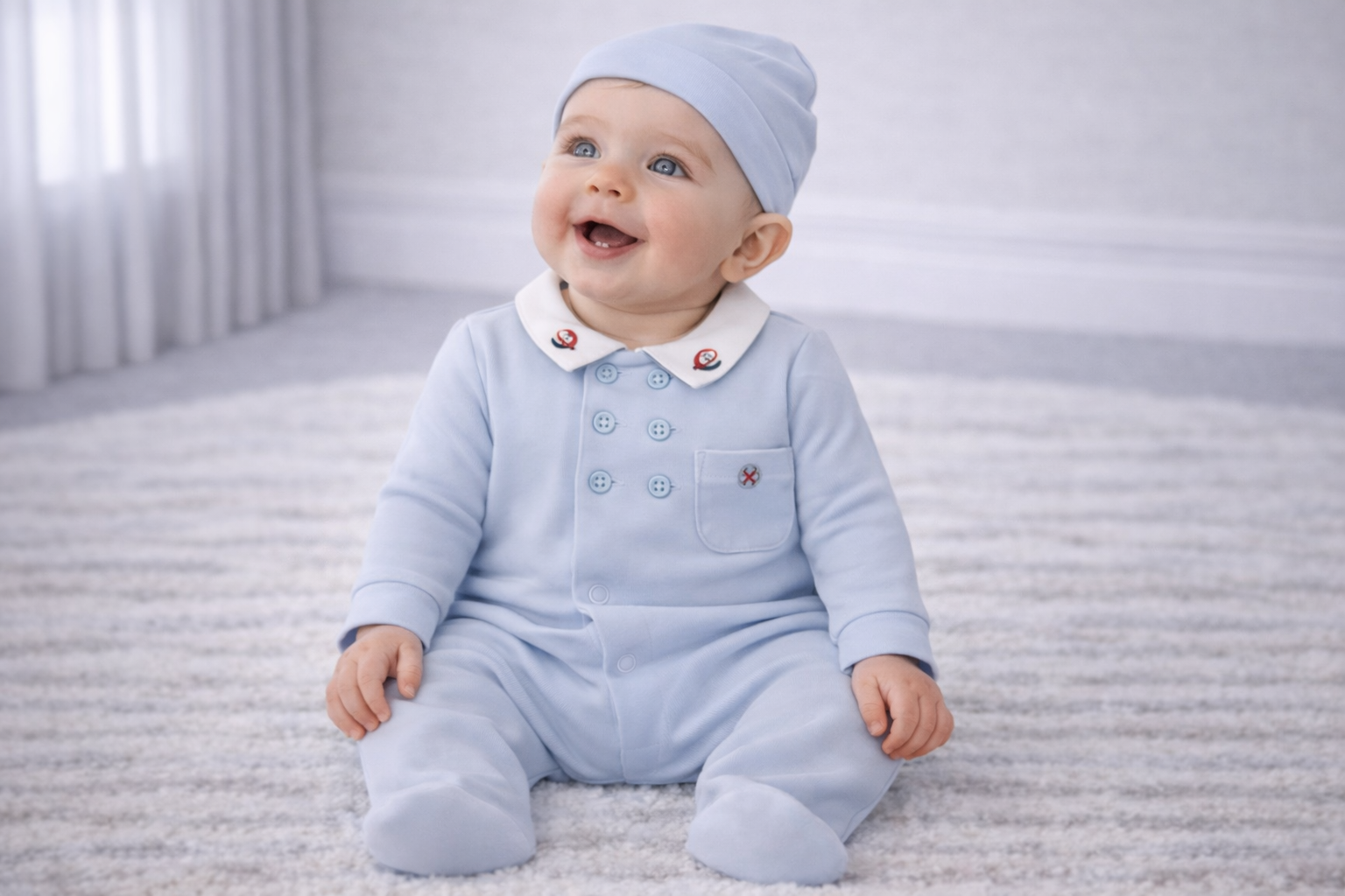 A soft sky-blue sailing outfit complete with matching hat — perfect for newborn cuddles, thoughtful gifts or adorable photos 💙⚓👶