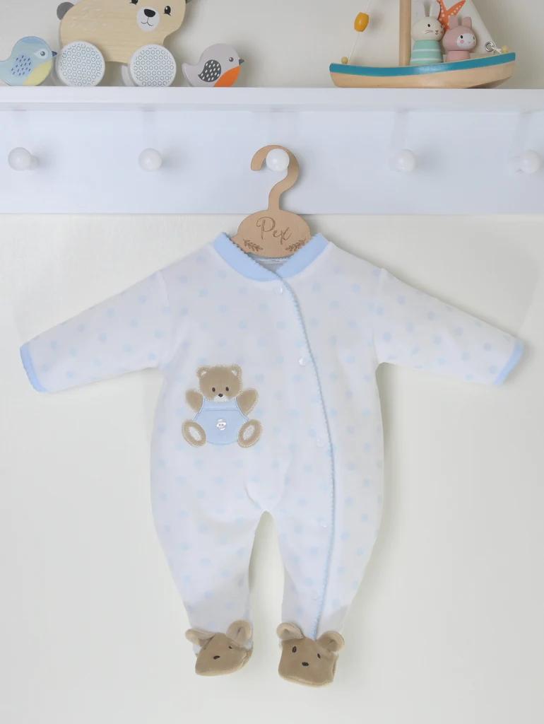 The sweetest little sleepsuit, crafted from wonderfully soft white velour with a pastel pink spot design. Thoughtfully detailed with an asymmetric press-stud fastening for easy changing, a teddy bear appliqué on the tummy, and bunny slipper-style feet for extra charm. Designed especially for premature and low birth weight babies, it’s as practical as it is adorable.
