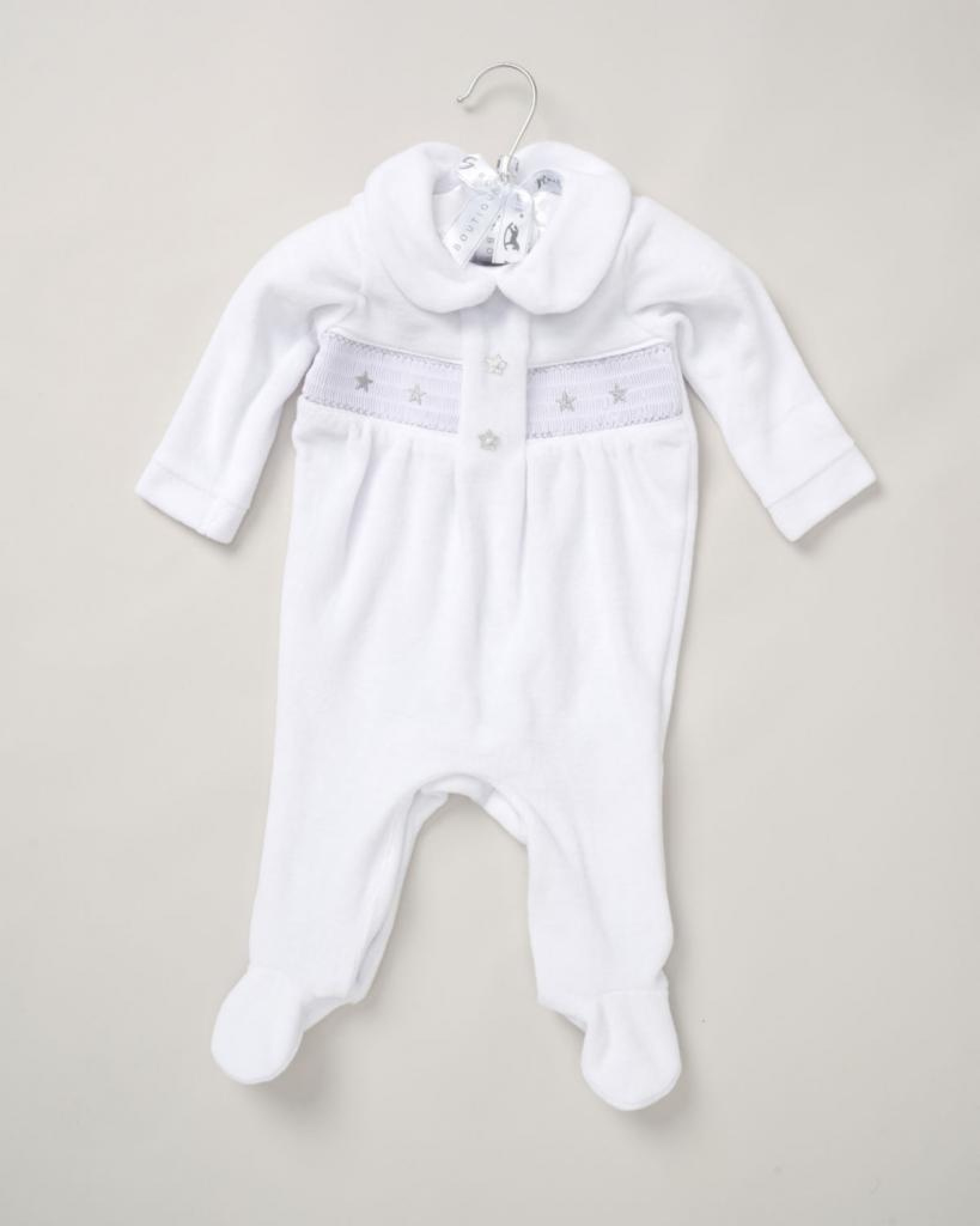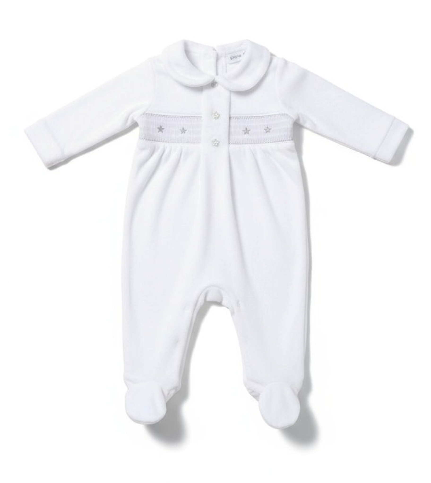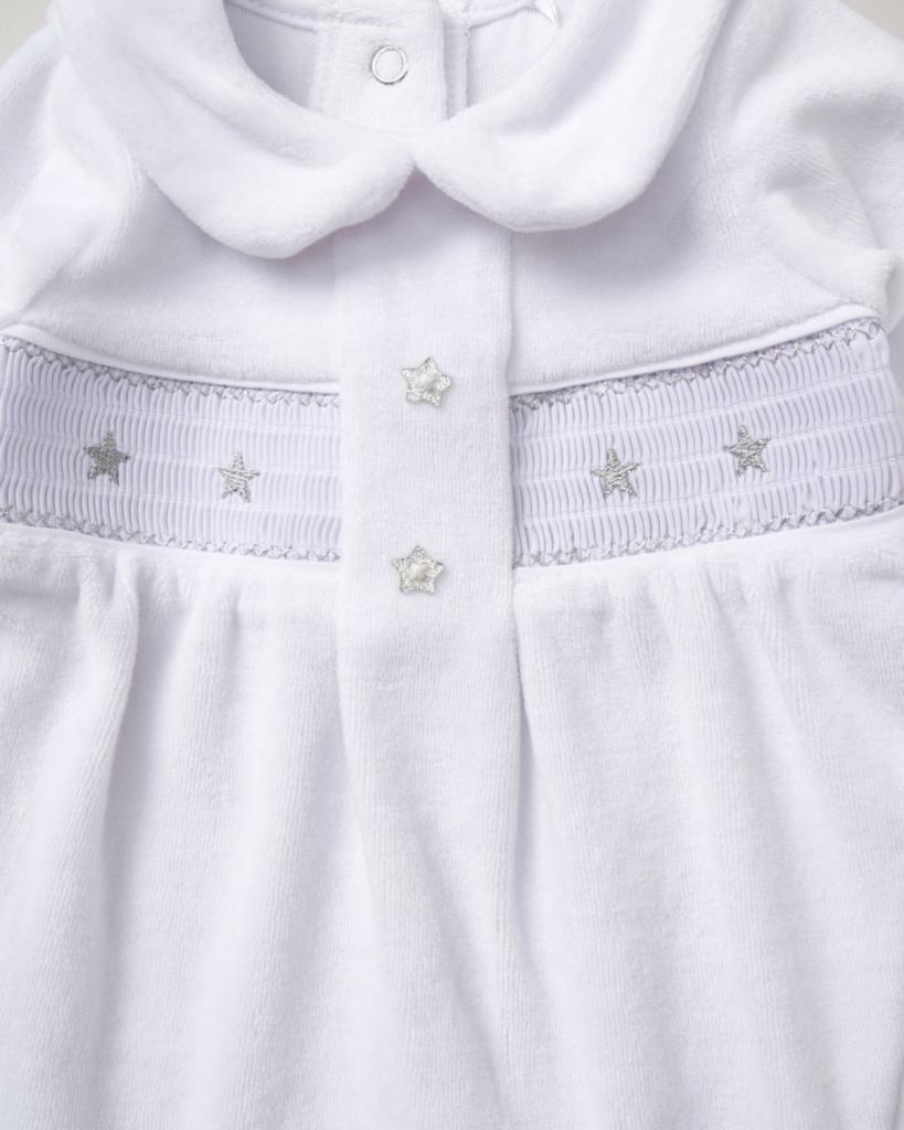 A beautifully soft velour all-in-one, perfect for everyday comfort or special occasions. This classic piece features delicate smocked star detailing across the front, finished with elegant pleat detailing and a sweet bow accent. Crafted from a soft polycotton velour, it’s gentle on delicate skin while keeping little ones cosy and comfortable.