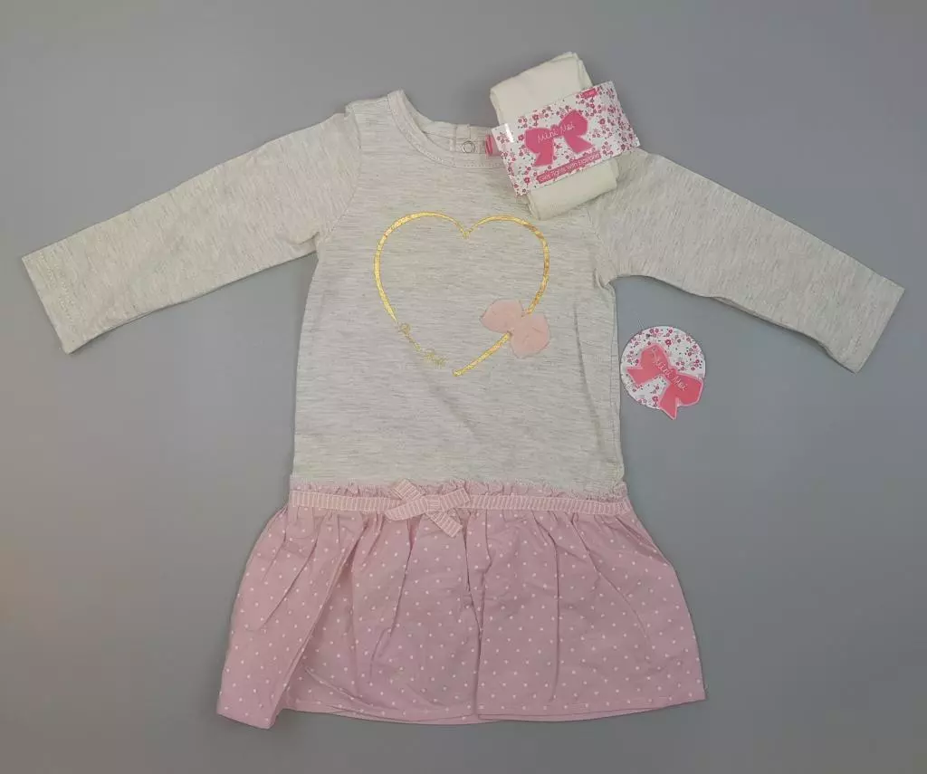 Adorable two-piece outfit featuring a soft heart print dress with matching tights — perfect for cosy days out or gifting ❤️👶