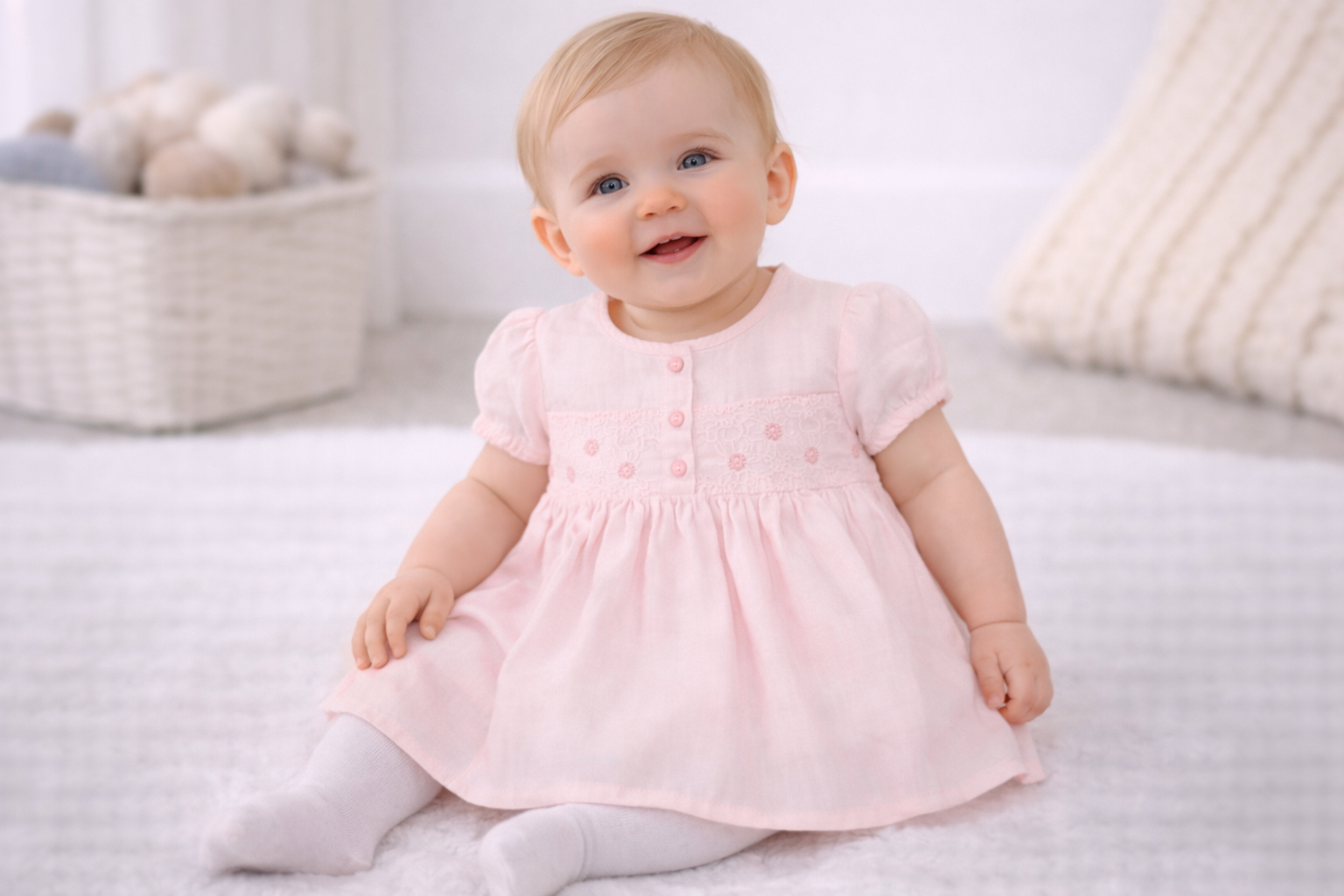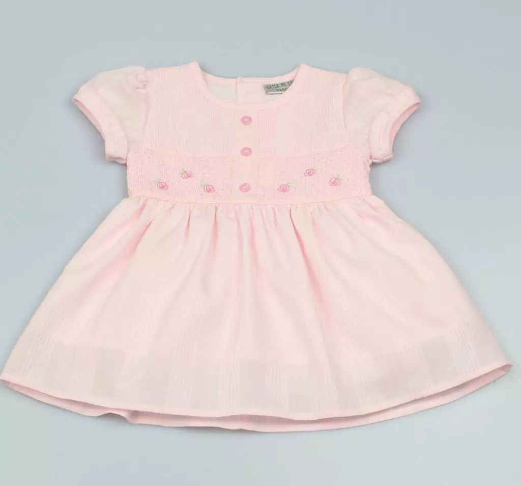A timeless smocked baby dress in soft pink, featuring button detailing to the front and a back button fastening for easy dressing. Made from a lightweight polycotton weave, it’s perfect for special occasions, photo sessions, or warm-weather outings.
